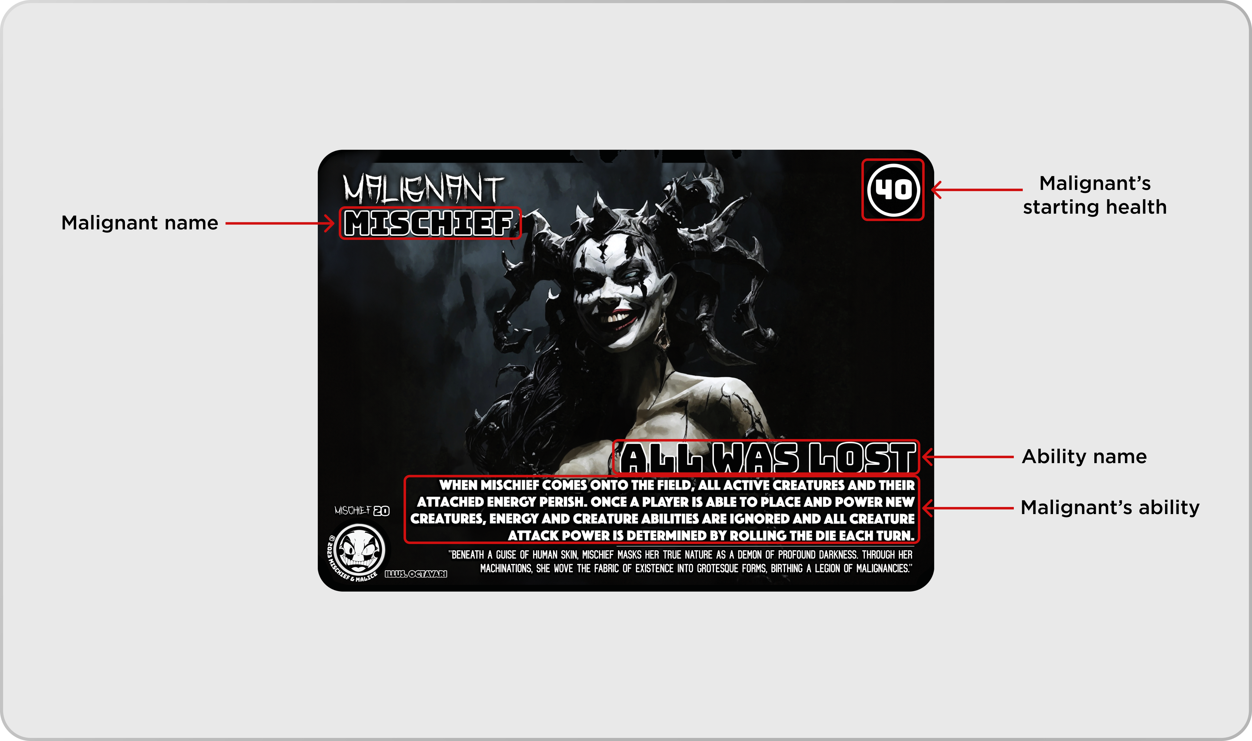 Some cards in the Mischief Deck contain Malignants (our version of a boss).  If a Malignant is drawn, each player must take turns attacking that Malignant (starting with the player that drew the Malignant card).  The same rules of gameplay for turns apply, except no player may attack another creature or have any effect on their opponent’s creatures until the Malignant reaches a health of 10 or lower. If a player is unable or chooses not to attack the Malignant on their turn, they do not void the normal 2 cards from hand when passing an attack but instead must deduct 5 health from their creature with the highest health on the field.  If 2 or more creatures are tied for the highest health, they may pick which of those to deduct the 5 health from. &#x20;