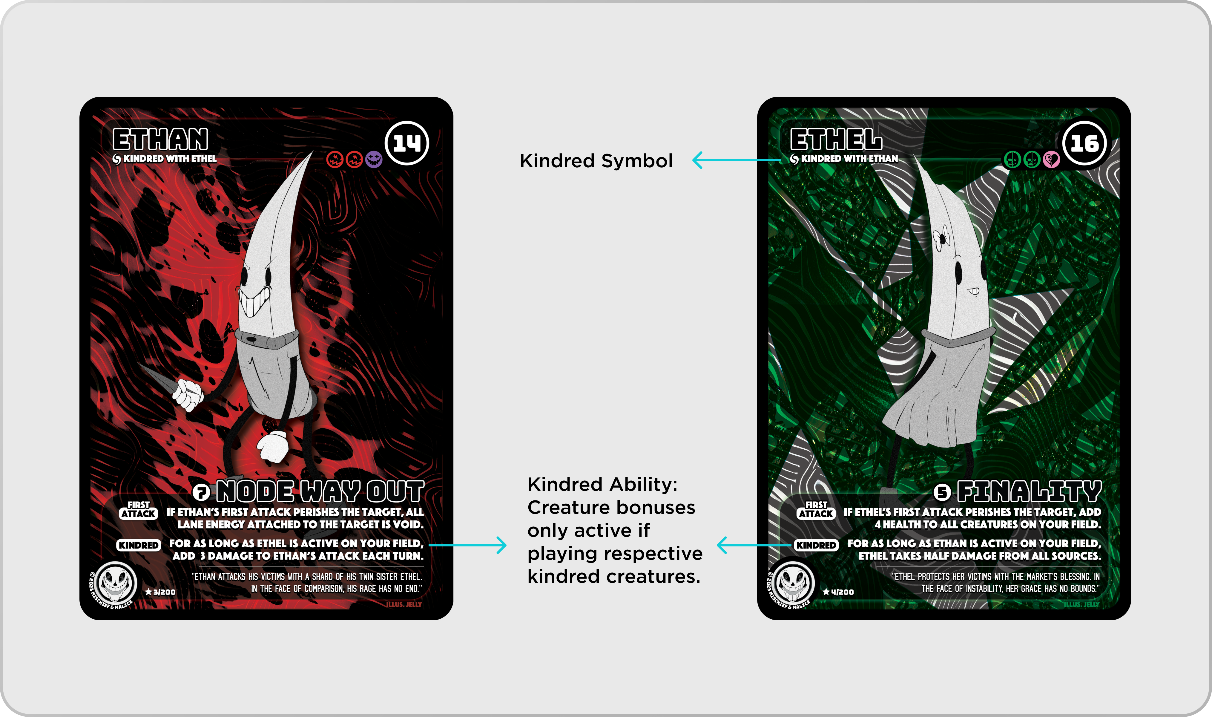 * **Kindred:** Some creatures have kindred creatures that are familial to them in some way. These creatures typically have kindred abilities that can only be applied under certain circumstances when playing matching kindreds in your deck. Kindred abilities do not stack with more kindred cards (i.e. each kindred ability cannot be applied twice/doubled if you have 2 of its kindred on the field, unless otherwise stated).