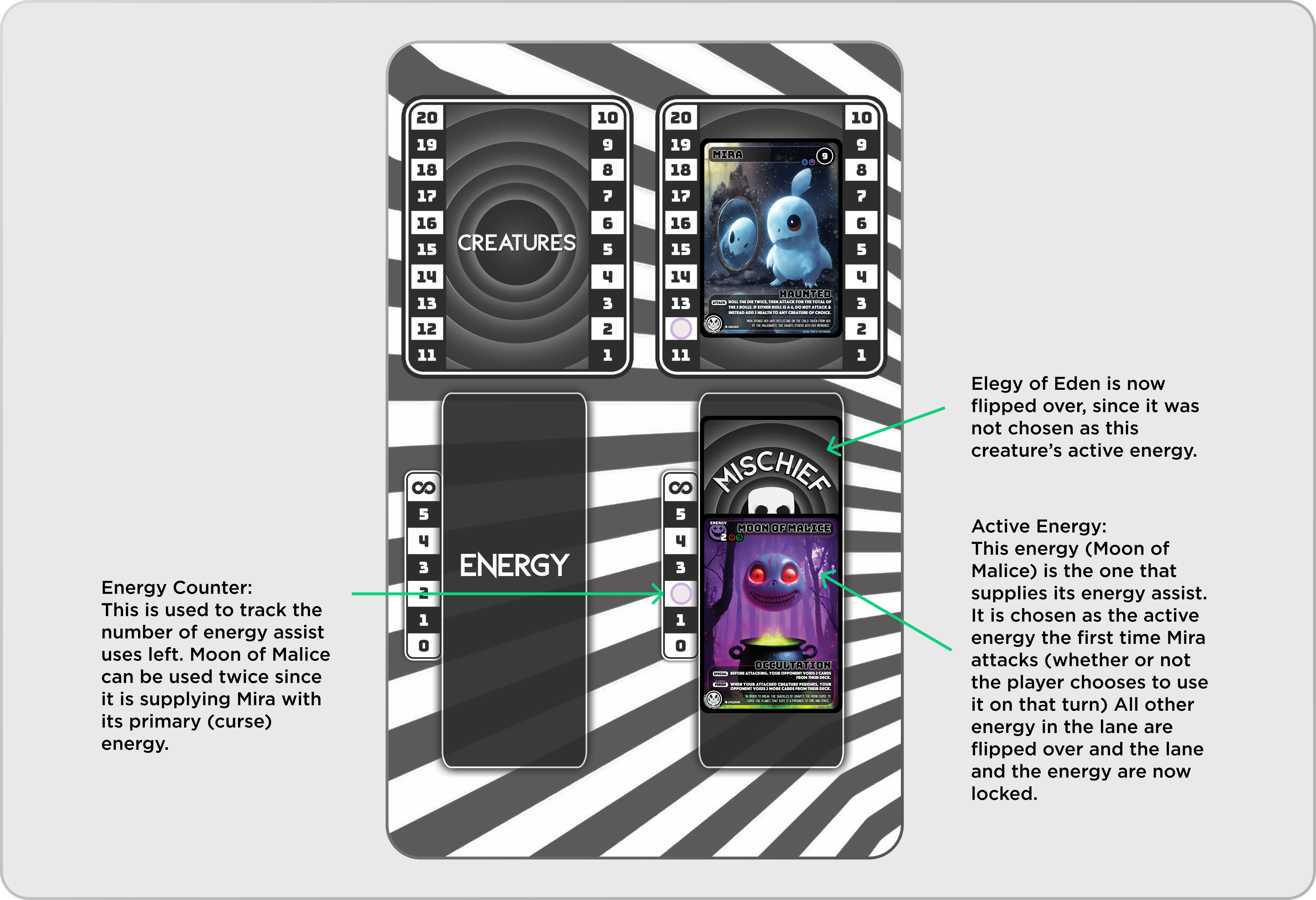 Creatures are unable to attack or use their abilities without energy cards. A creature is considered active once it has an energy card for each type in the upper right corner of its card. Each energy card is only counts as 1 of the required energies to power the creature. Universal energies can be used to provide any type, but you may only have one universal energy in each energy lane.