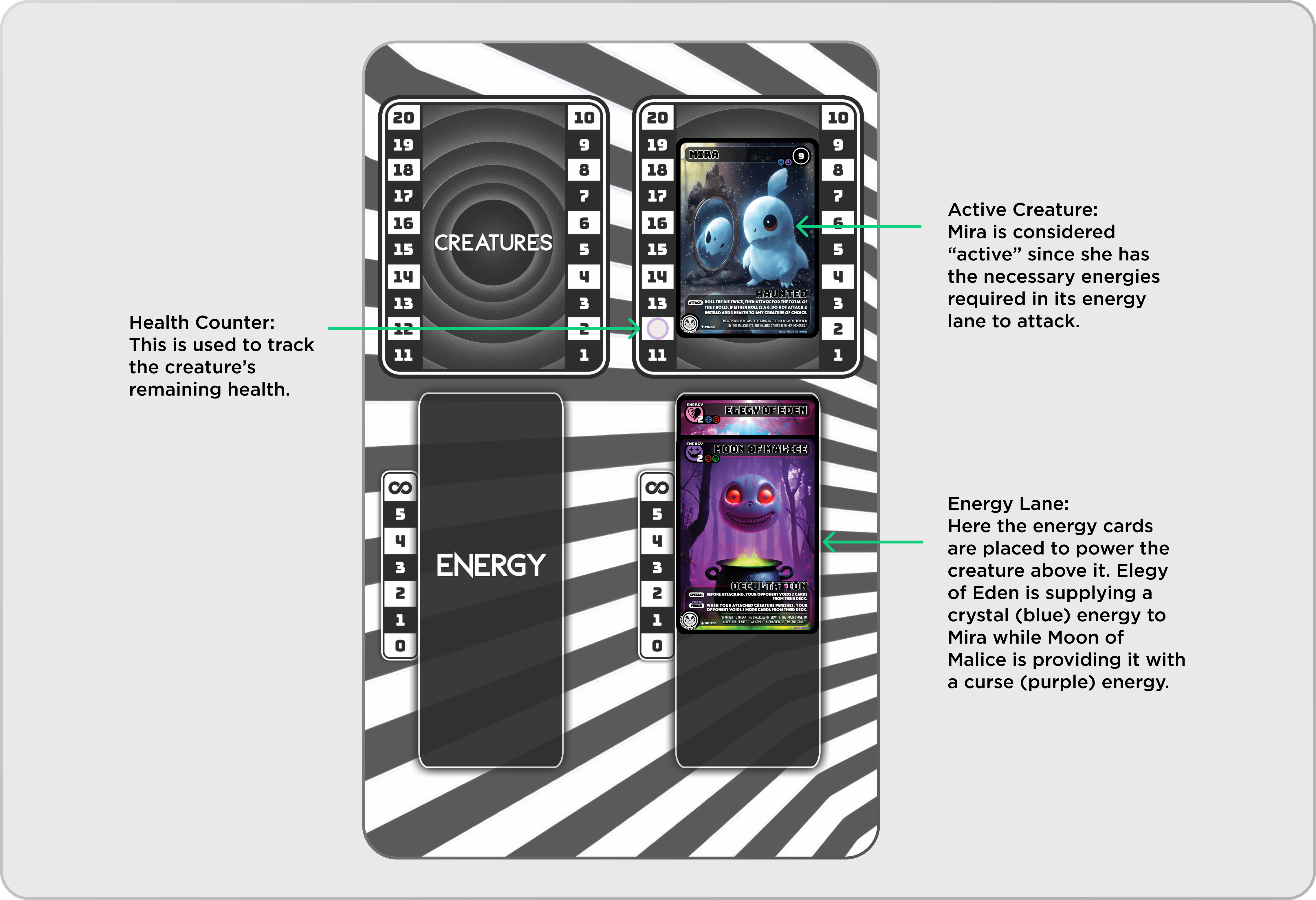 Each player is permitted to have up to 1 benched creature at a time. Placing a benched creature counts as the player’s 1 creature placement per turn. If desired, a player may use 1 of the 2 energy cards they can place per turn to power their benched creature; however, this creature cannot attack or be attacked until moved onto the field. Some creatures have bench abilities that are only active on the bench. If a player already has a creature on the bench at the start of their turn, they may also choose to void it and place a different creature on the bench in its place (all energy remains in lane). This also counts as their one creature placement per turn. Once a player has placed down their desired creatures and energies for the turn, the benched creature and all of its associated energy cards (if present) may be moved to any empty field spot with a vacant energy lane (unless the bench had no energy on it when the creature is moved, in which case it can be may be moved to an empty creature spot with preloaded energies). Bench energy lanes are limited to a maximum of 6 energies, while the creature energy lanes are limited to 5.